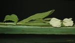 2012twee witte tulpen op grijsgroene plank