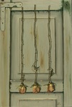 2012drie hangende rozen op een groen oud luik