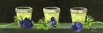 2012Drie gele aardewerken potjes met liggende blauwe anemonen