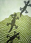2018De prent bestaat uit 3 over elkaar afgedrukte platen in zelfgemengde aardtinten. Iedere prent is uniek en in diverse kleuren verkrijgbaar